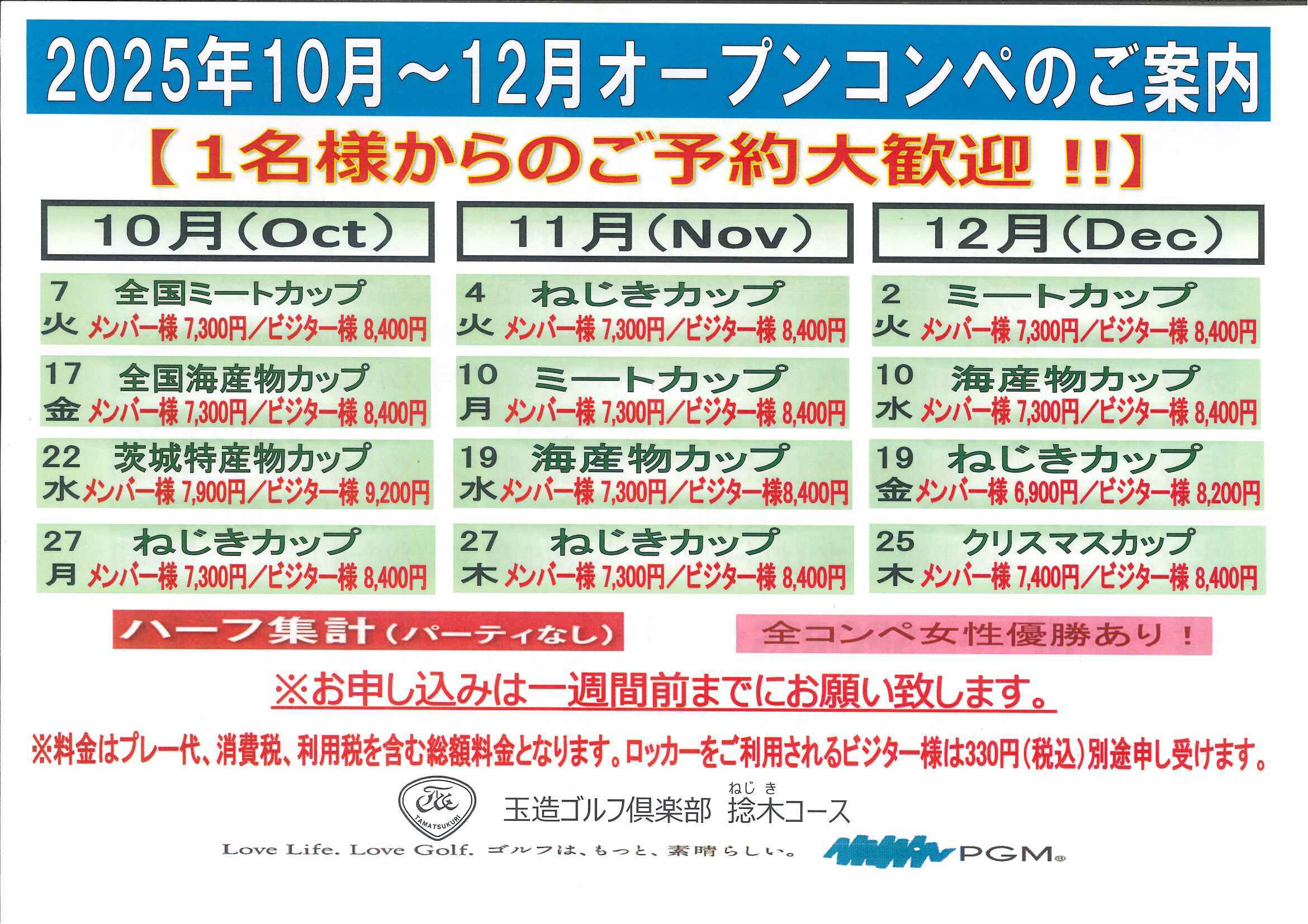 2025年10月-12月のオープンコンペの日程をお知らせ致します。 オープンコンペは前半9ホールのハーフ集計で、参加者全員に賞品をご用意して開催しております。 お一人様よりご予約ご参加いただけます。 パーティーはございません。 ご精算時に賞品をお渡しいたします。 皆様のご参加をスタッフ一同心よりお待ち申し上げております。