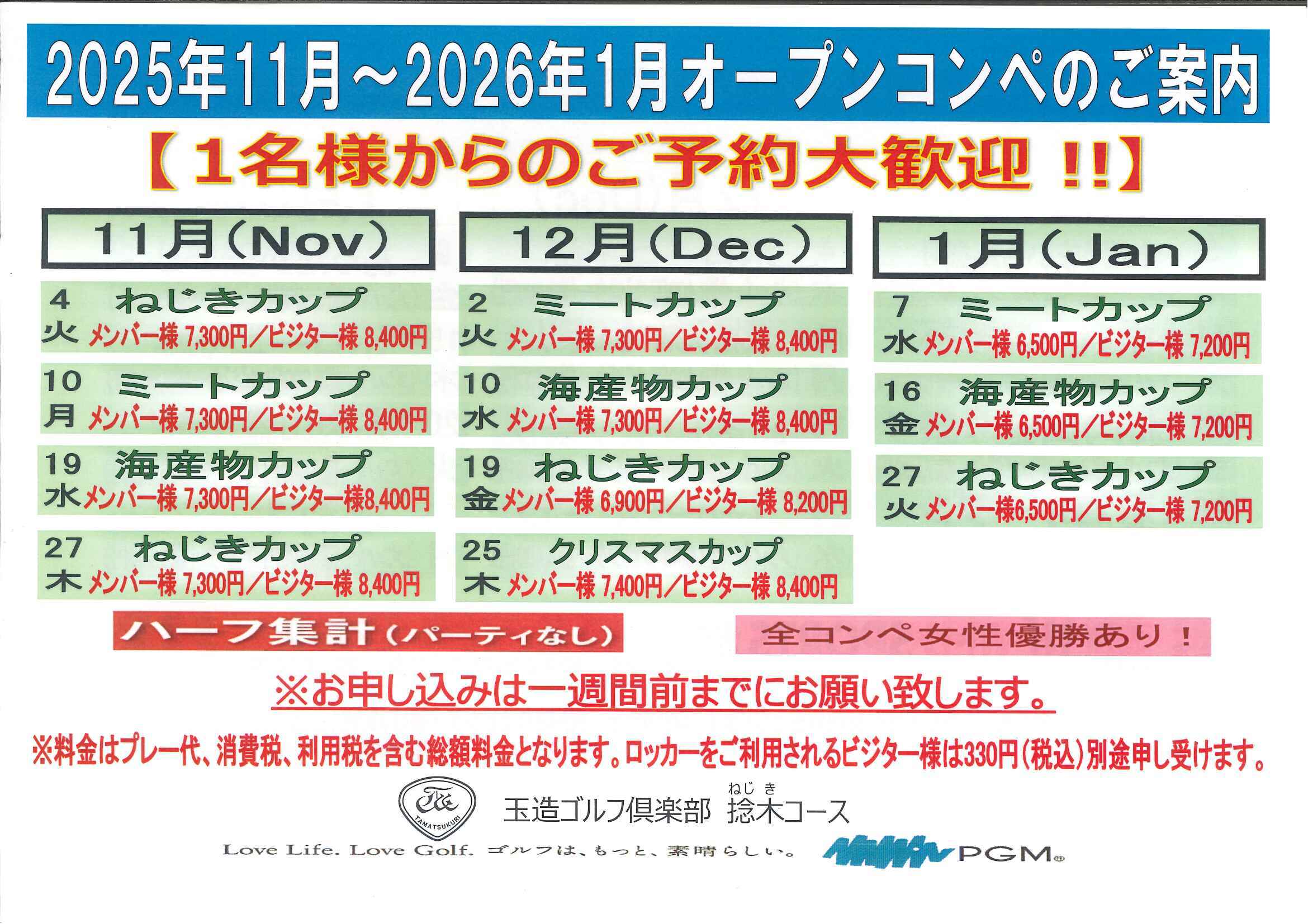 2025年11月-2026年1月のオープンコンペの日程をお知らせ致します。 オープンコンペは前半9ホールのハーフ集計で、参加者全員に賞品をご用意して開催しております。 お一人様よりご予約ご参加いただけます。 パーティーはございません。 ご精算時に賞品をお渡しいたします。 皆様のご参加をスタッフ一同心よりお待ち申し上げております。