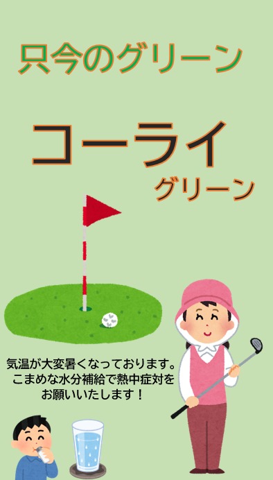 いつもご覧いただきまして 誠にありがとうございます。 使用グリーンのお知らせです。 本日7月8日(火)より、コーライグリーンとなりますので よろしくお願いいたします。 本格的に暑くなりましたので 熱中症対策をお願いいたします。