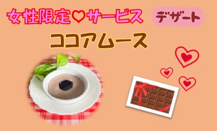 レストランよりお知らせです♪ 女性の方限定!! 食後のデザートにココアムースを サービスさせて頂いております(^^♪ あっさりとしたココアムースに甘いチョコソースが とっても合うデザートです(^^)/ 2月3月限定になります☆