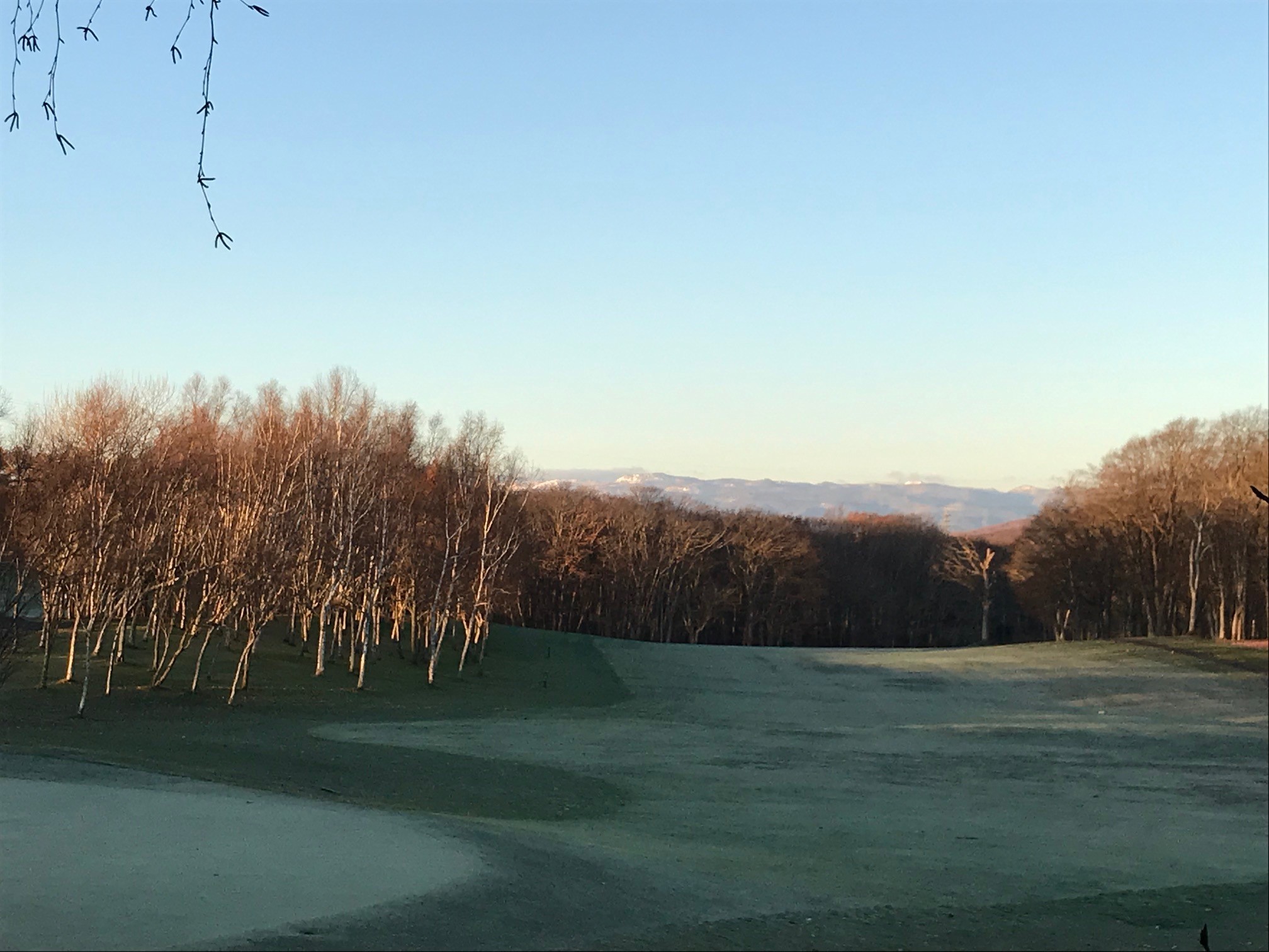 添付写真は、東9番の現在(7:00am)ですが、遠くの山には冠雪が見えますね。マイナス1℃にて霜も降りておりますが、快晴であり、トップスタート9時までには無くなるでしょう。(開場は、8:00amとなります)