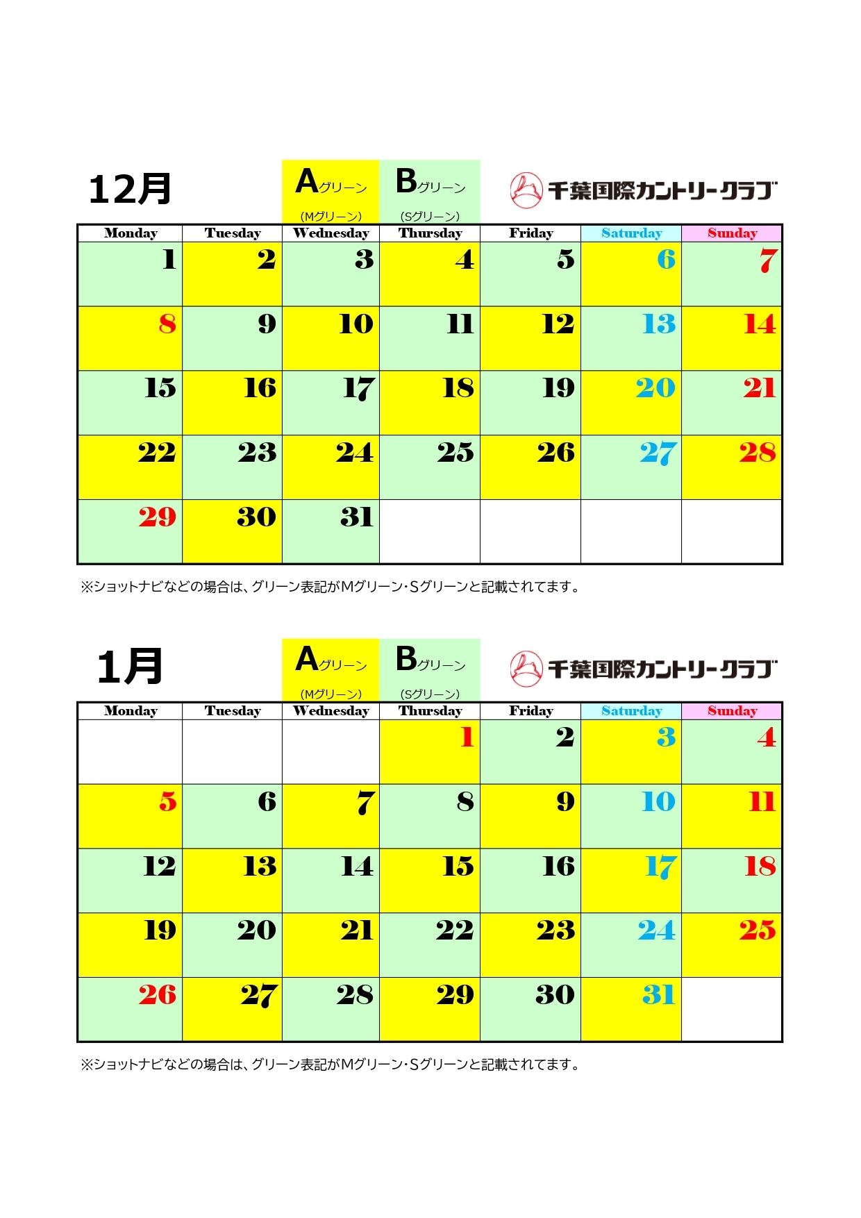 12月&1月の竹コースグリーンスケジュールを更新いたしました。