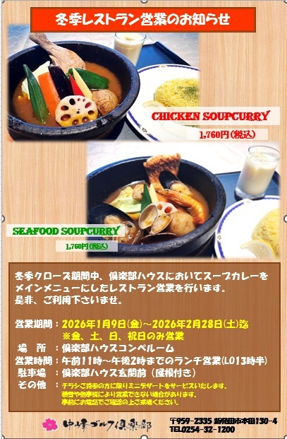 1/9より毎週金・土・日・祝日に冬季レストラン営業を 開始いたします。 中峰人気メニューのスープカレー2種をメインとした 営業となります。 皆様お誘いあわせの上お越しください。 スタッフ一同心よりお待ち申し上げております。 営業時間 :11:00~14:00(LO13:30) 駐車場利用:倶楽部ハウス玄関前(屋根付き)