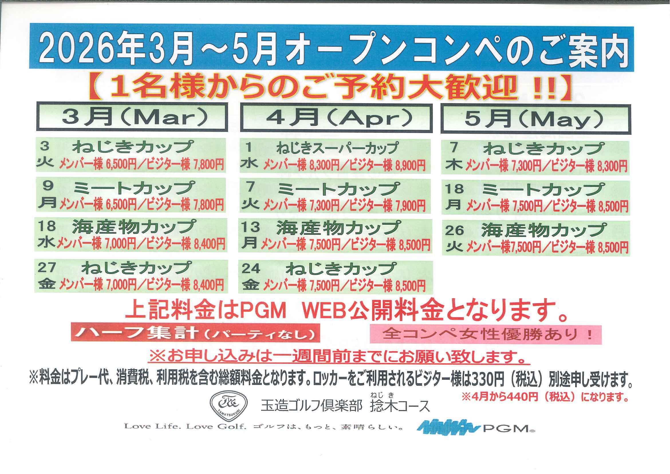 2026年3月-2026年5月のオープンコンペの日程をお知らせ致します。 オープンコンペは前半9ホールのハーフ集計で、参加者全員に賞品をご用意して開催しております。 お一人様よりご予約ご参加いただけます。 パーティーはございません。 ご精算時に賞品をお渡しいたします。 皆様のご参加をスタッフ一同心よりお待ち申し上げております。