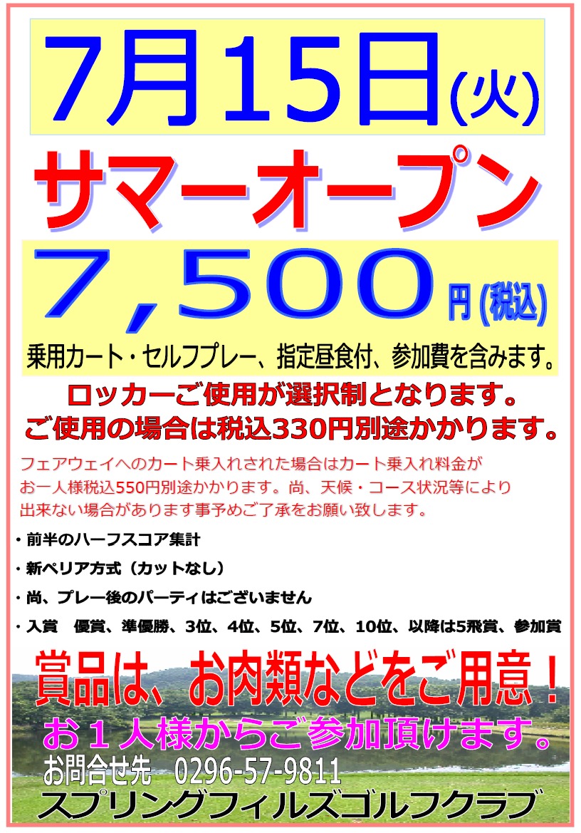 7月のオープンコンペ ・7/15(火) 「サマーオープン」 賞品は お肉類など をメインにご準備しております。 ご予約はおひとりさまからご参加頂けます。 前半9H集計で全員に賞品をご用意致します。 皆様のご参加、お待ちしております。