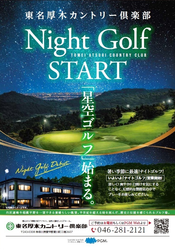 2026年6月よりナイトゴルフを開始いたします。 日中に比べ涼しく快適にプレーいただけます。 夏の強い日差し、暑さ、日焼けが気になる女性の方にもオススメです。 ご予約はお電話またはフロントにてお申し込みください。 TEL046-281-2121