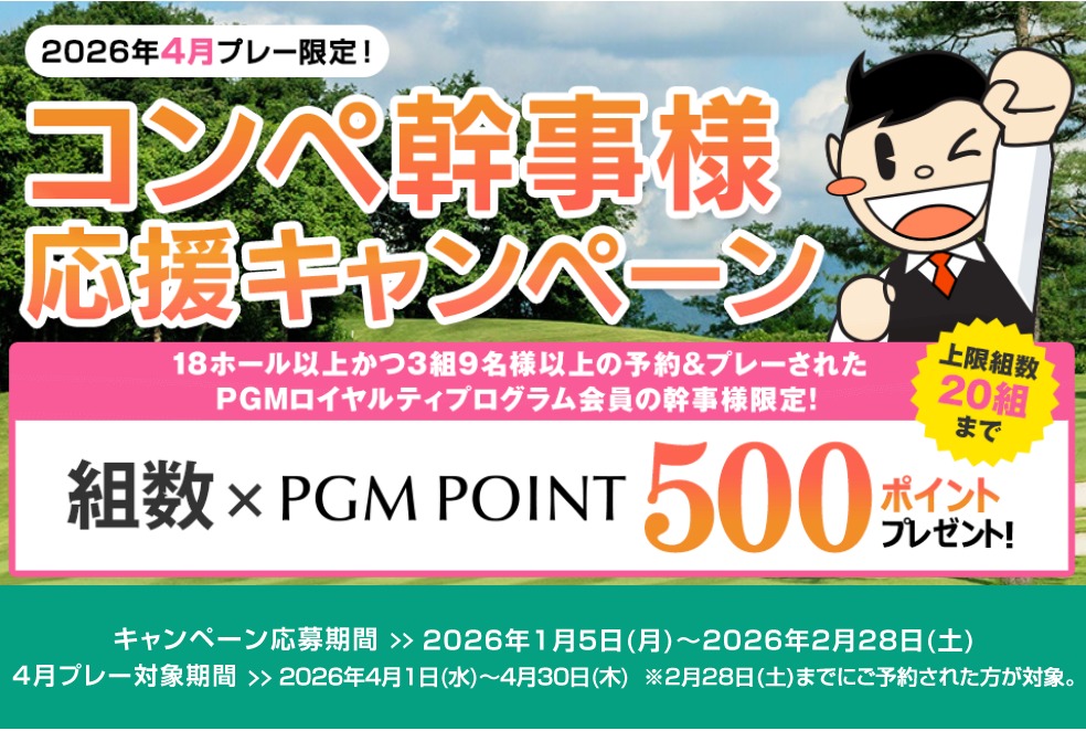 プレーされたPGMロイヤルティプログラム会員の予約代表者様に、プレー人数×PGMポイント300ポイントをプレゼントいたします。※上限人数80名様まで
