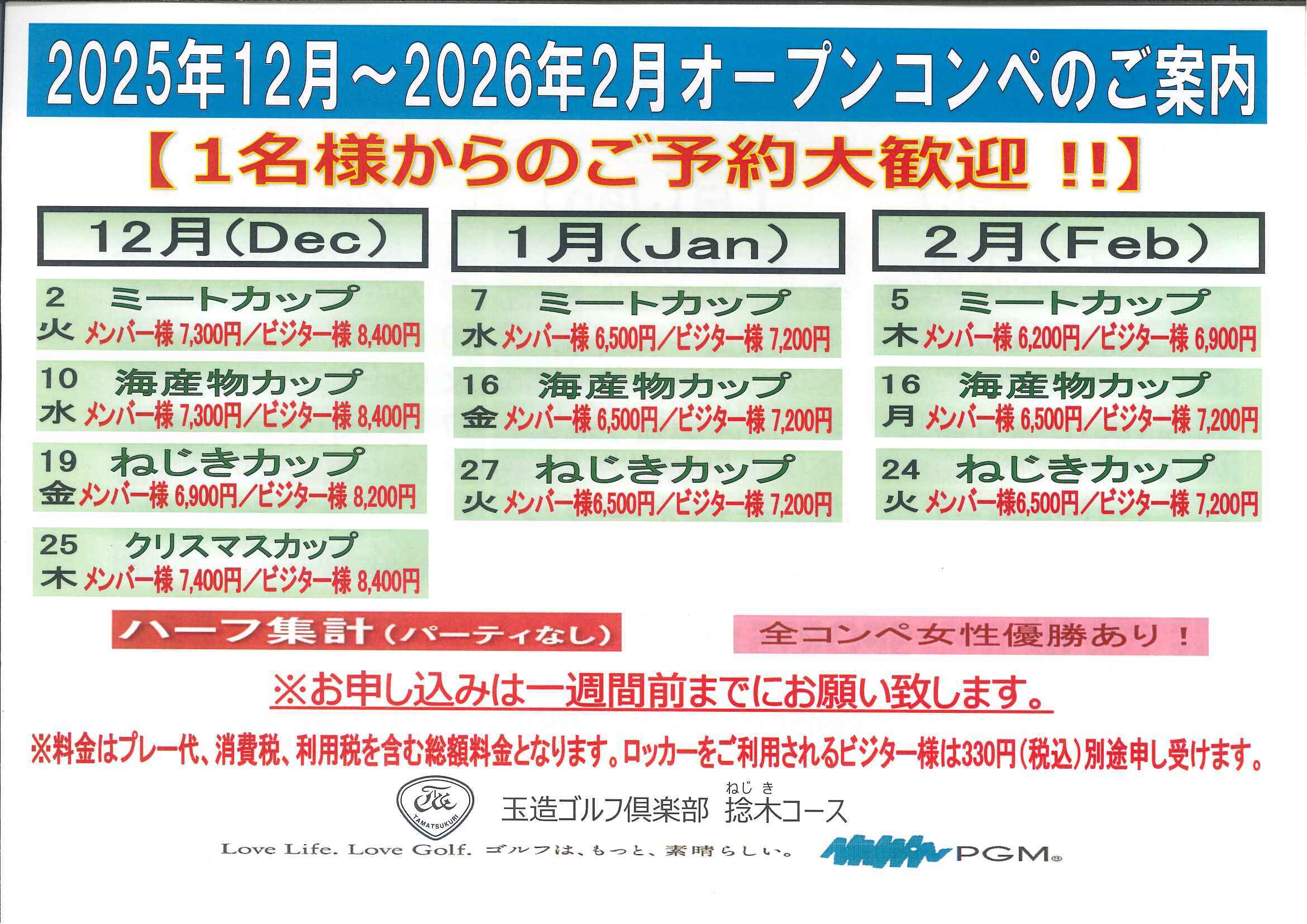2025年12月-2026年2月のオープンコンペの日程をお知らせ致します。