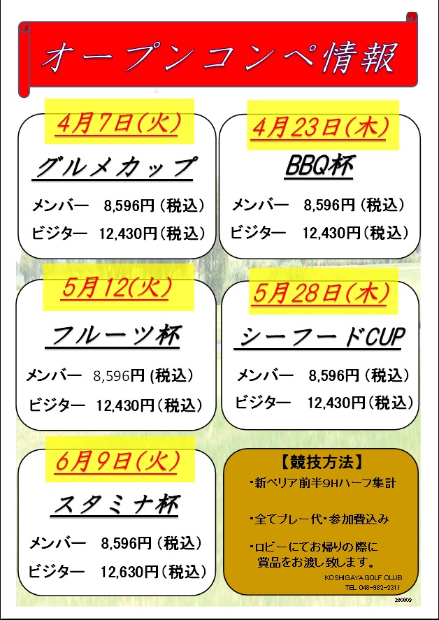 2026年4月~2026年6月のオープンコンペの日程でございます。 皆様全員に賞品がございます。 是非ご参加ください。