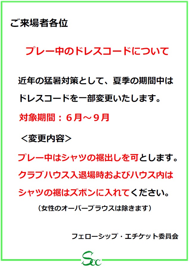 本年6月~9月の期間中は、猛暑対策の為、「プレー中のシャツの裾出しを可とする」ことになりました。