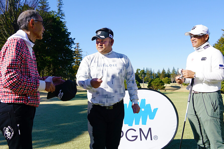 12月とは思えない暖かさの中、95名のお客様が参加し、withGolfのPGMサポートプロとラウンドしました。PGMスポンサーシップ契約プロの宮里 聖志プロ、宮里 優作プロ、杉浦 悠太プロ、笠 りつ子プロ、柏原 明日架プロ、清本 美波プロのショットを間近で見れるほか、ツーショット写真の撮影やサインをもらうなどのアトラクションを用意し、思い出に残る特別な一日をお過ごしいただきました。